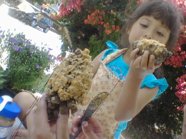 Okay, so the second project was a bird feeder. We found some pine cones earlier in the morning. After cleaning them, I tied a string around the top. The girls covered them with peanut butter and rolled it in bird seed (J ate most of the peanut butter before it even got near the pine cone hahaha).